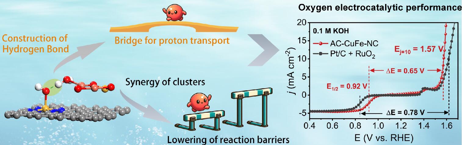 基于此,研究工作2報(bào)道了一種原子全暴露的Fe摻雜的CuO團(tuán)簇與單原子位點(diǎn)協(xié)同的新型催化劑。實(shí)驗(yàn)和DFT計(jì)算表明:一方面,協(xié)同的Cu-O-Fe 團(tuán)簇能有效誘導(dǎo)鐵單原子位點(diǎn)的電子結(jié)構(gòu)重新分布、調(diào)節(jié)氧吸附能并降低 ORR 勢(shì)壘;另一方面,譜學(xué)表征和理論計(jì)算表明Cu-O-Fe團(tuán)簇協(xié)同構(gòu)建了含氧反應(yīng)中間體與電解質(zhì)分子之間的氫鍵,所構(gòu)建的氫鍵不僅可以穩(wěn)定含氧反應(yīng)中間體,同時(shí)拉伸了ORR最后一步的Fe-O鍵長,有助于OH*的脫附;更為質(zhì)子傳輸提供了通道,提高了反應(yīng)動(dòng)力學(xué)。這項(xiàng)研究中展示的新穎的催化劑結(jié)構(gòu)和協(xié)同機(jī)制,為開發(fā)綠色能源轉(zhuǎn)換裝置中的高性能催化劑提供了新的視角和參考。