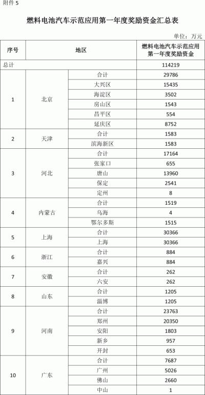 根據(jù)公示文件,第一年度共有10個(gè)省級(jí)行政區(qū)獲得燃料電池車(chē)示范應(yīng)用獎(jiǎng)勵(lì)資金,其中北京29786萬(wàn)元、天津1583萬(wàn)元、河北17164萬(wàn)元、內(nèi)蒙古1519萬(wàn)元、上海30366萬(wàn)元、浙江884萬(wàn)元、安徽262萬(wàn)元、山東1205萬(wàn)元、河南23763萬(wàn)元、廣東7687萬(wàn)元,總計(jì)114219萬(wàn)元。
