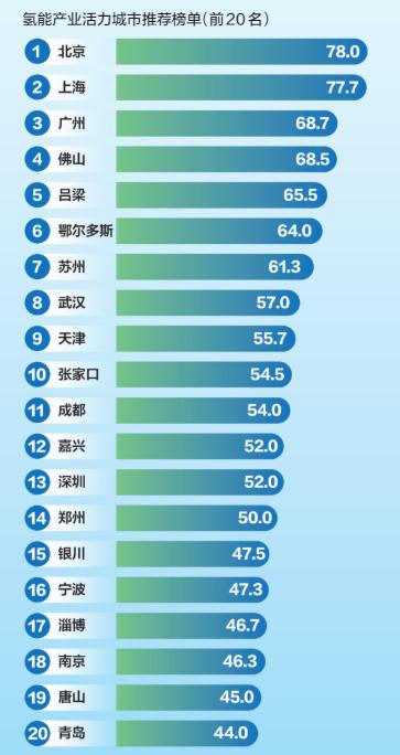 基于全國氫能產(chǎn)業(yè)發(fā)展的地區(qū)分布特點(diǎn) ,新京報零碳研究院對主要城市的氫能資源稟賦 、政策環(huán)境 、產(chǎn)業(yè)規(guī)模 、項目投資 、基礎(chǔ)設(shè)施和企業(yè)數(shù)量等維度數(shù)據(jù)進(jìn)行了量化和綜合評價 ,篩選出了全國20個氫能產(chǎn)業(yè)發(fā)展活力城市 。具體城市名單如下: