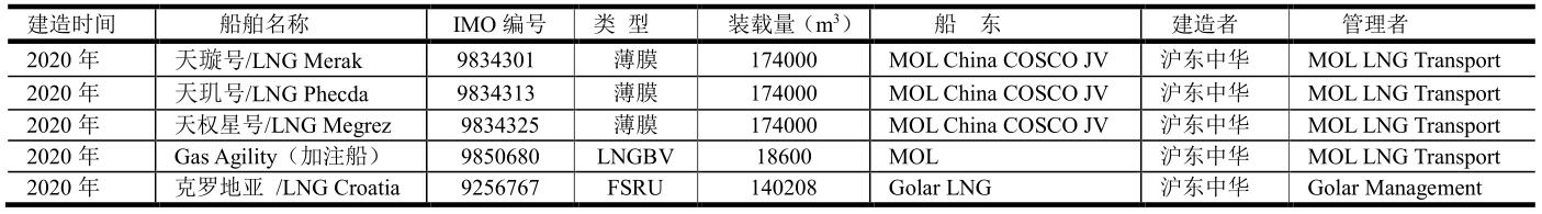 2020年中國交付的LNG船舶