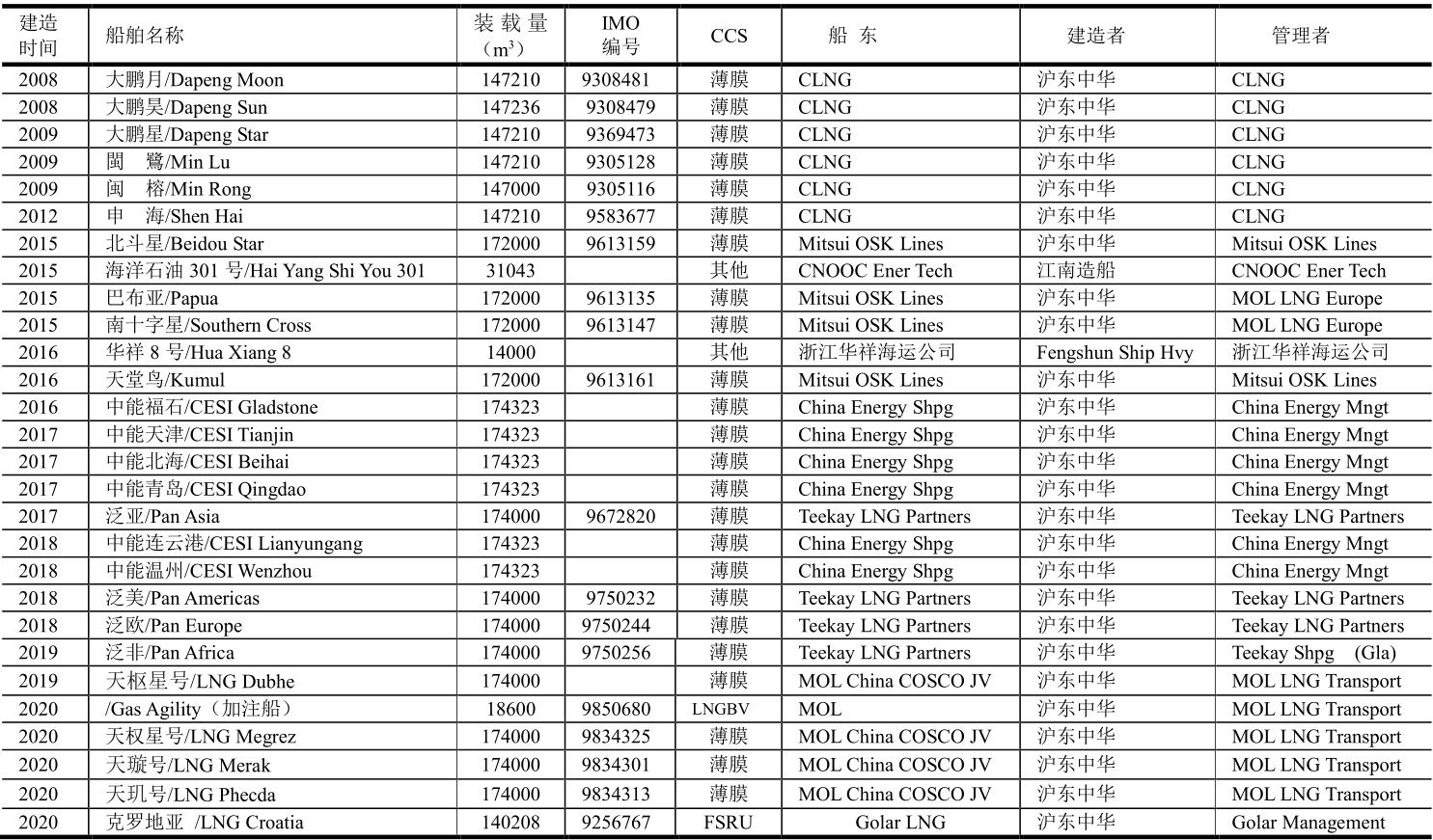 2020年底中國FSRU船舶