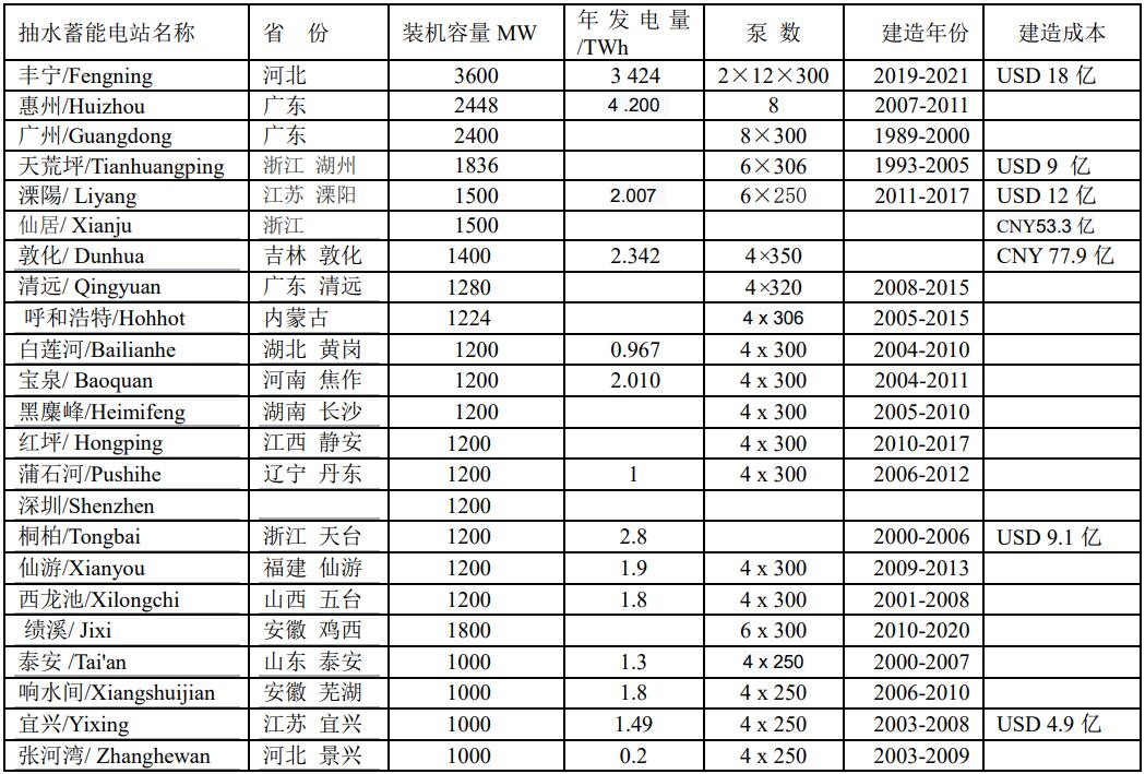 中國裝機(jī)容量大于1000MW運(yùn)行的抽水蓄能電站