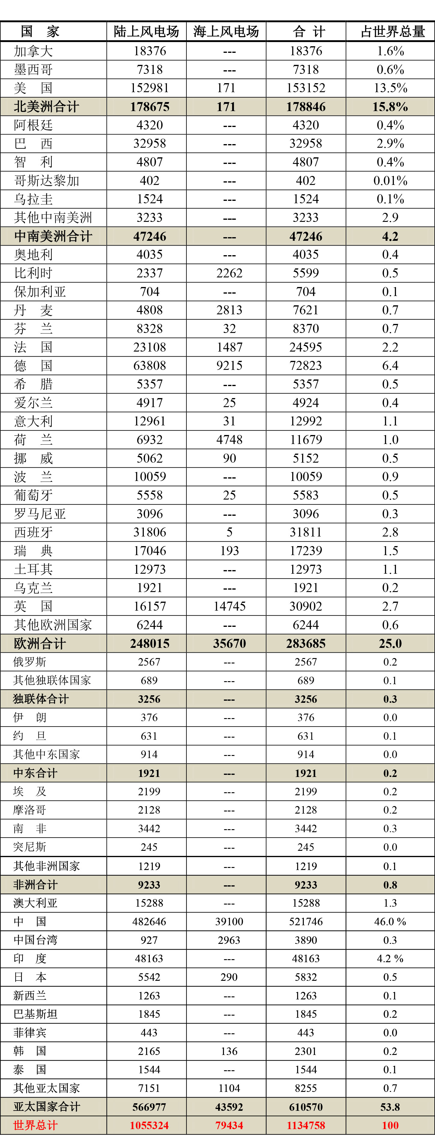 ⑴ 按照地區(qū)計(jì),2024年全球亞太地區(qū)風(fēng)電場(chǎng)裝機(jī)容量最多,達(dá)610579MW占世界總量610579/1134758=53.8%,其次為歐洲達(dá)283685MW,占總量的25%,北美洲地區(qū)居第三位,達(dá)178846MW,占總量的15.8%。