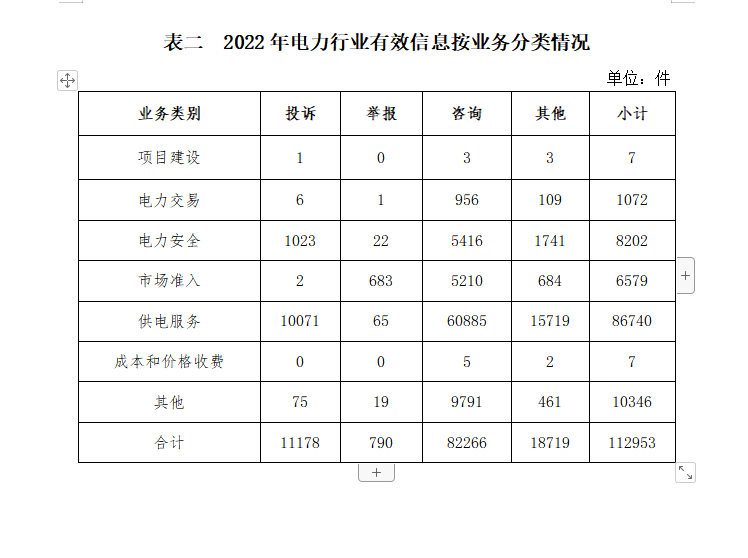 電力行業(yè)排在首位,有效信息數(shù)量為112953件,占全部有效信息的68.82%。群眾關注的內容主要集中在供電服務、電力安全、市場準入等方面。(2022年電力行業(yè)有效信息按業(yè)務分類情況見表二)
