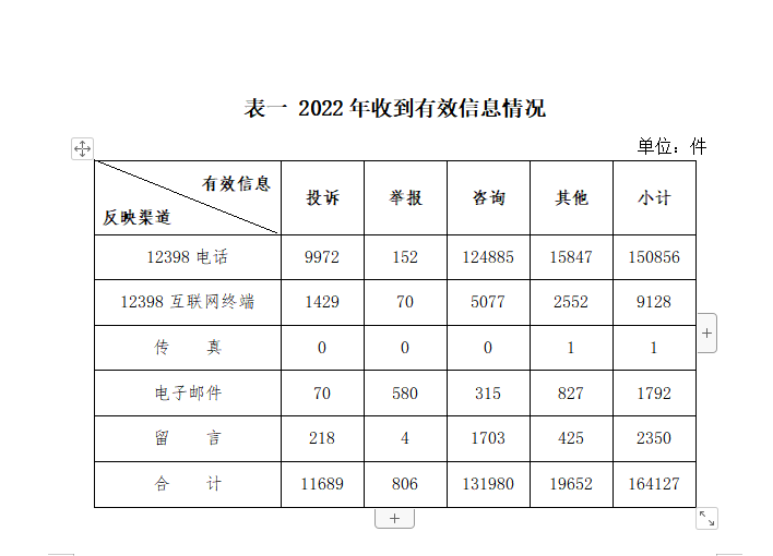 按反映渠道分類,12398電話150856件,12398互聯(lián)網(wǎng)終端9128件,傳真1件,電子郵件1792件,留言2350件。