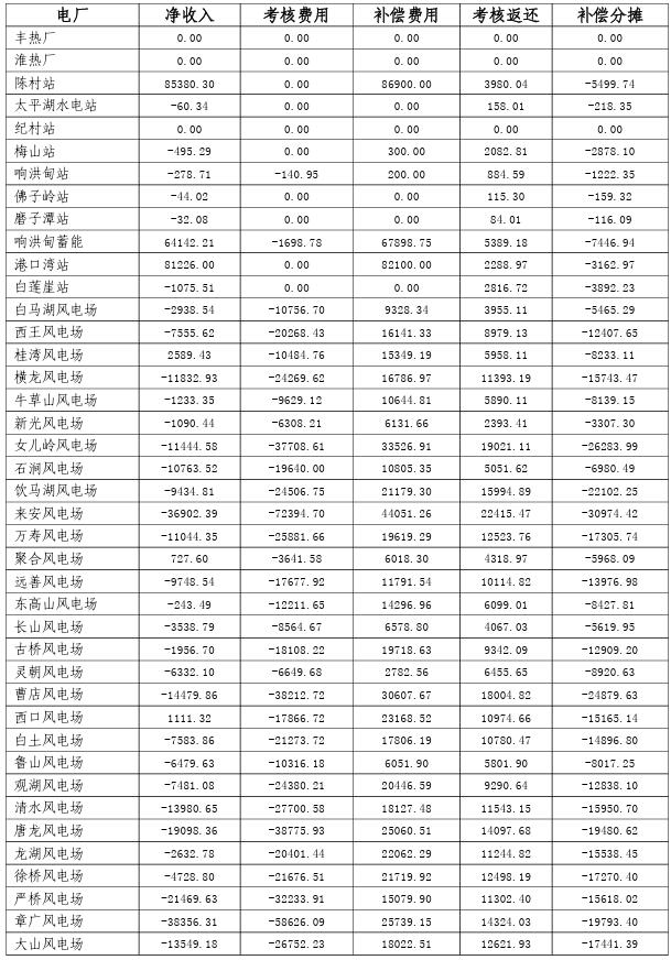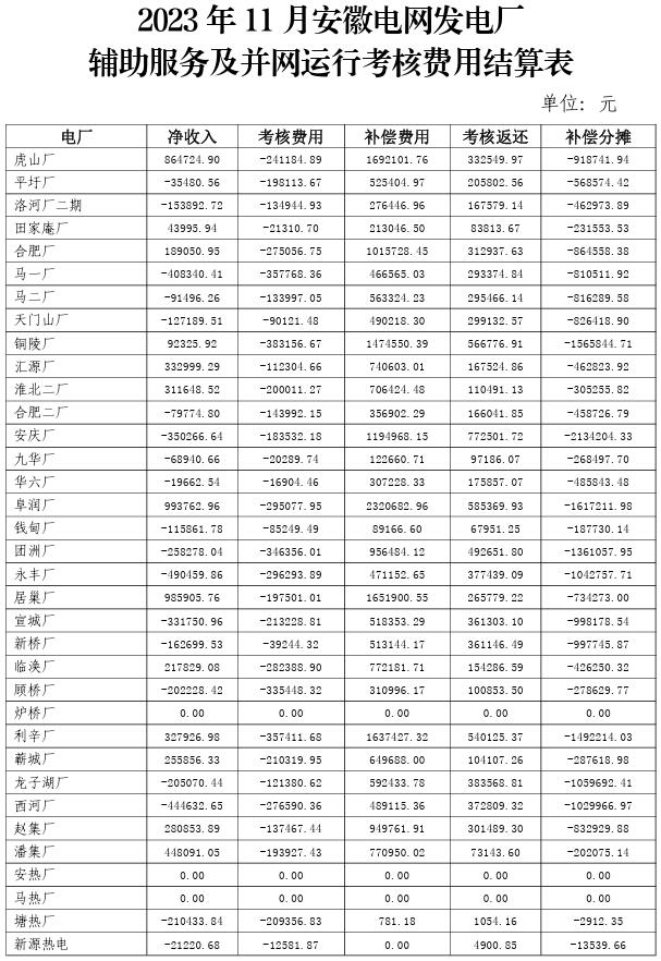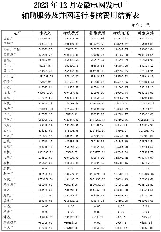 根據(jù)華東區(qū)域“兩個細則”規(guī)則要求,國網(wǎng)安徽省電力有限公司完成了2023年10-12月直調(diào)電廠并網(wǎng)運行考核、輔助服務(wù)補償統(tǒng)計計算,并向我局報送了并網(wǎng)運行考核及輔助服務(wù)補償情況。其中,吉泉直流配套跨省跨區(qū)新建火電機組調(diào)試運行期差額資金共計8882813.74元,納入12月輔助服務(wù)補償。2023年10-12月安徽電網(wǎng)發(fā)電廠輔助服務(wù)補償及并網(wǎng)運行考核費用結(jié)算表詳見附件,現(xiàn)予公示。如有不同意見,可于3月1日前向我局反映。