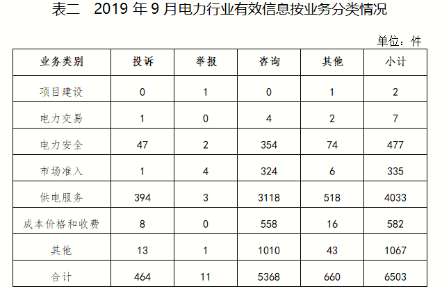 電力行業(yè)排在首位,有效信息數(shù)量為6503件,占全部有效信息的77.62%;其中受理的投訴舉報(bào)數(shù)量為475件,占全部投訴舉報(bào)數(shù)量的94.81%。群眾反映的問題主要集中在供電服務(wù)、電力安全、成本價(jià)格和收費(fèi)等方面。(2019年9月電力行業(yè)有效信息按業(yè)務(wù)分類情況見表二)