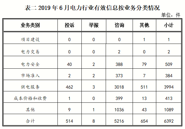電力行業(yè)排在首位,有效信息數(shù)量為6392件,占全部有效信息的80.33%;其中受理的投訴舉報(bào)數(shù)量為522件,占全部投訴舉報(bào)數(shù)量的93.38%。群眾反映的問題主要集中在供電服務(wù)、電力安全、成本價(jià)格和收費(fèi)等方面。(2019年6月電力行業(yè)有效信息按業(yè)務(wù)分類情況見表二)