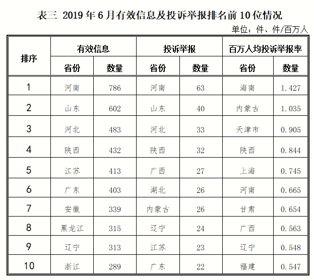 各省(自治區(qū)、直轄市)按照收到的有效信息數(shù)量排序,河南、山東、河北、陜西、江蘇等列全國前10位;按照投訴舉報(bào)數(shù)量排序,河南、山東、河北、陜西、廣西等排在全國前10位。按照百萬人均投訴舉報(bào)數(shù)量排序,海南、內(nèi)蒙古、天津、陜西、上海等排在全國前10位。(2019年6月有效信息及投訴舉報(bào)排名前10位情況見表三)