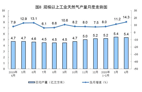 天然氣生產(chǎn)加快。4月份,生產(chǎn)天然氣161億立方米,同比增長14.3%,增速比上月加快3.1個(gè)百分點(diǎn),日均產(chǎn)量5.4億立方米。1—4月份,生產(chǎn)天然氣644億立方米,同比增長10.3%。