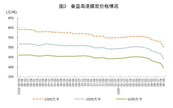 煤炭進(jìn)口增長較快,交易價(jià)格有所下跌。4月份,進(jìn)口煤炭3095萬噸,同比增長22.3%;1—4月份,進(jìn)口煤炭1.3億噸,同比增長26.9%。港口煤炭綜合交易價(jià)格繼續(xù)下跌,5月8日秦皇島港5500、5000和4500大卡煤炭價(jià)格分別為每噸501元、442元和396元,比4月3日分別下跌39元、41元和36元。