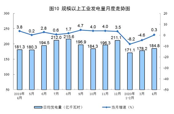 電力生產(chǎn)由降轉(zhuǎn)增。4月份,發(fā)電量5543億千瓦時(shí),同比增長0.3%,上月為下降4.6%,日均發(fā)電量184.8億千瓦時(shí),環(huán)比增加6.6億千瓦時(shí)。1—4月份,發(fā)電量21388億千瓦時(shí),同比下降5.0%。
