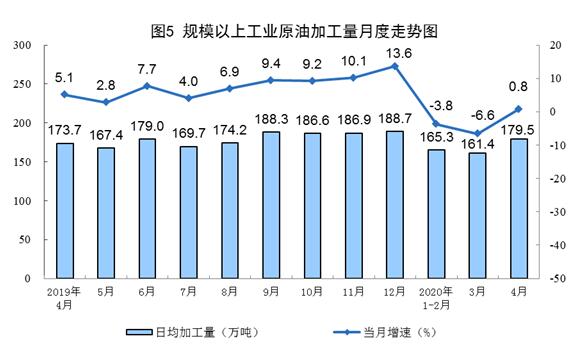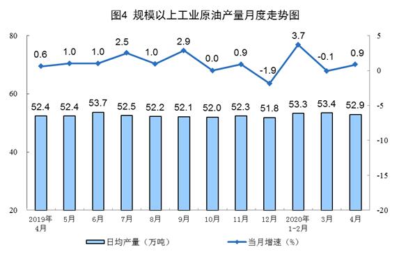 原油生產(chǎn)平穩(wěn),加工量由降轉(zhuǎn)增。4月份,生產(chǎn)原油1587萬噸,同比增長0.9%,增速由負(fù)轉(zhuǎn)正,上月為下降0.1%,日均產(chǎn)量52.9萬噸;加工原油5385萬噸,同比增長0.8%,上月為下降6.6%,日均加工179.5萬噸。1—4月份,生產(chǎn)原油6444萬噸,同比增長2.0%;加工原油20348萬噸,同比下降3.4%。