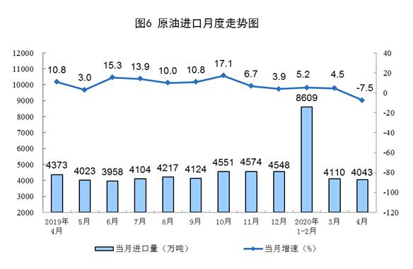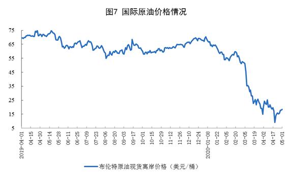 原油進(jìn)口下降,國際原油價(jià)格低位震蕩。4月份,進(jìn)口原油4043萬噸,同比下降7.5%。1—4月份,進(jìn)口原油16761萬噸,同比增長1.7%。4月30日布倫特原油現(xiàn)貨離岸價(jià)格為18.11美元/桶,比3月31日的14.85美元/桶上漲22.0%。