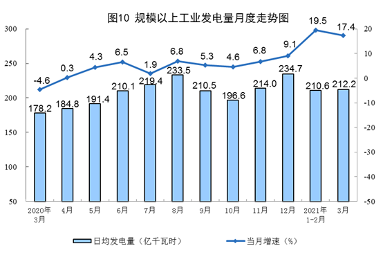 電力生產(chǎn)增長較快。3月份,發(fā)電6579億千瓦時(shí),同比增長17.4%,比2019年3月份增長12.0%,兩年平均增長5.8%,日均發(fā)電212.2億千瓦時(shí)。一季度,發(fā)電19051億千瓦時(shí),同比增長19.0%,比2019年一季度增長10.8%,兩年平均增長5.3%。