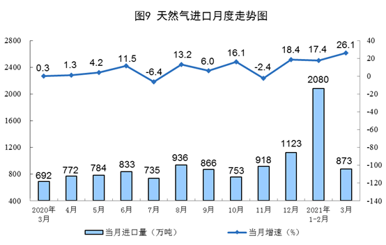 天然氣進(jìn)口大幅增長。3月份,進(jìn)口天然氣873萬噸,同比增長26.1%。一季度,進(jìn)口天然氣2939萬噸,同比增長19.6%。