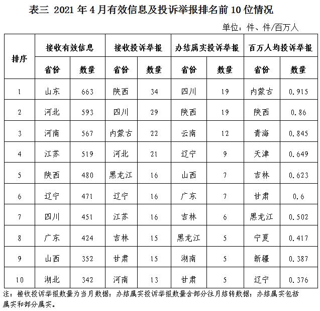 各省(自治區(qū)、直轄市)按照收到的有效信息數(shù)量排序,山東、河北、河南、江蘇、陜西、遼寧、四川、廣東、山西、湖北等列全國前10位;按照投訴舉報(bào)數(shù)量排序,陜西、四川、內(nèi)蒙古、河北、黑龍江、遼寧、江蘇、吉林、甘肅、河南等排在全國前10位;按照辦結(jié)屬實(shí)投訴舉報(bào)數(shù)量排序,四川、陜西、云南、遼寧、山西、廣東、吉林、黑龍江、湖南、甘肅等排在全國前10位;按照百萬人均投訴舉報(bào)數(shù)量排序,內(nèi)蒙古、陜西、青海、天津、吉林、甘肅、黑龍江、寧夏、新疆、遼寧等排在全國前10位。(2021年4月有效信息及投訴舉報(bào)排名前10位情況見表三)