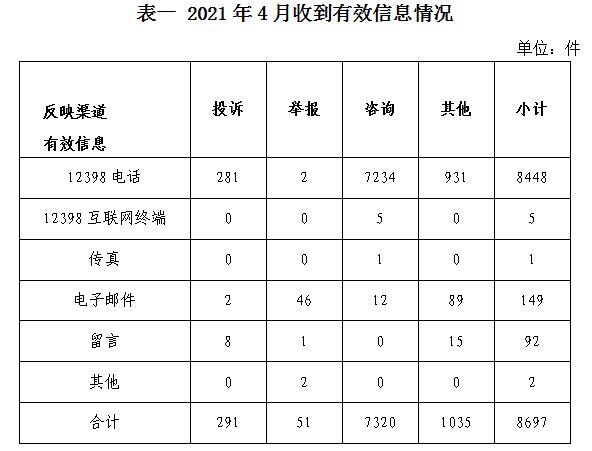 2021年4月,國家能源局12398能源監(jiān)管熱線(以下簡(jiǎn)稱12398熱線)共收到有效信息8697件(包含投訴、舉報(bào)、咨詢和其他訴求類別),環(huán)比增加3.13%,同比減少1.43%。(2021年4月收到有效信息情況見表一)