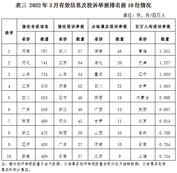各省(自治區(qū)、直轄市)按照接收的有效信息數(shù)量排序,河南、河北、山東、江蘇、四川、廣東、陜西、浙江、遼寧、安徽排在全國前10位;按照接收的投訴舉報數(shù)量排序,四川、江蘇、山東、河南、遼寧、浙江、河北、陜西、廣東、云南排在全國前10位;按照辦結屬實的投訴舉報數(shù)量排序,湖南、湖北、重慶、四川、陜西、廣西、甘肅、山西、河南、江蘇排在全國前10位;按照百萬人均投訴舉報數(shù)量排序,青海、天津、遼寧、甘肅、內(nèi)蒙古、陜西、北京、吉林、云南、上海排在全國前10位。(2022年3月有效信息及投訴舉報排名前10位情況見表三)