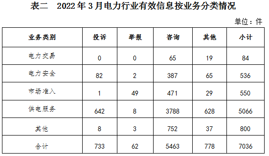 電力行業(yè)排在首位,有效信息數(shù)量為7036件,占全部有效信息的67.76%。群眾關注的內(nèi)容主要集中在供電服務、故障停電、供電安全等方面。(2022年3月電力行業(yè)有效信息按業(yè)務分類情況見表二)