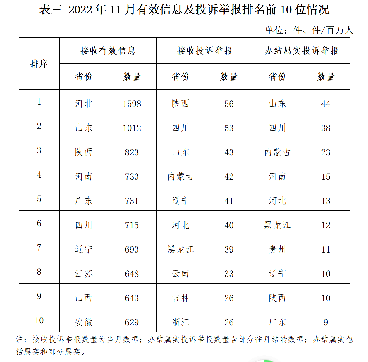 各省(自治區(qū)、直轄市)按照接收的有效信息數(shù)量排序,河北、山東、陜西、河南、廣東、四川、遼寧、江蘇、山西、安徽排在全國前10位;按照接收的投訴舉報數(shù)量排序,陜西、四川、山東、內(nèi)蒙古、遼寧、河北、黑龍江、云南、吉林、浙江排在全國前10位;按照辦結(jié)屬實的投訴舉報數(shù)量排序,山東、四川、內(nèi)蒙古、河南、河北、黑龍江、貴州、遼寧、陜西、廣東古排在全國前10位。(2022年11月有效信息及投訴舉報排名前10位情況見表三)
