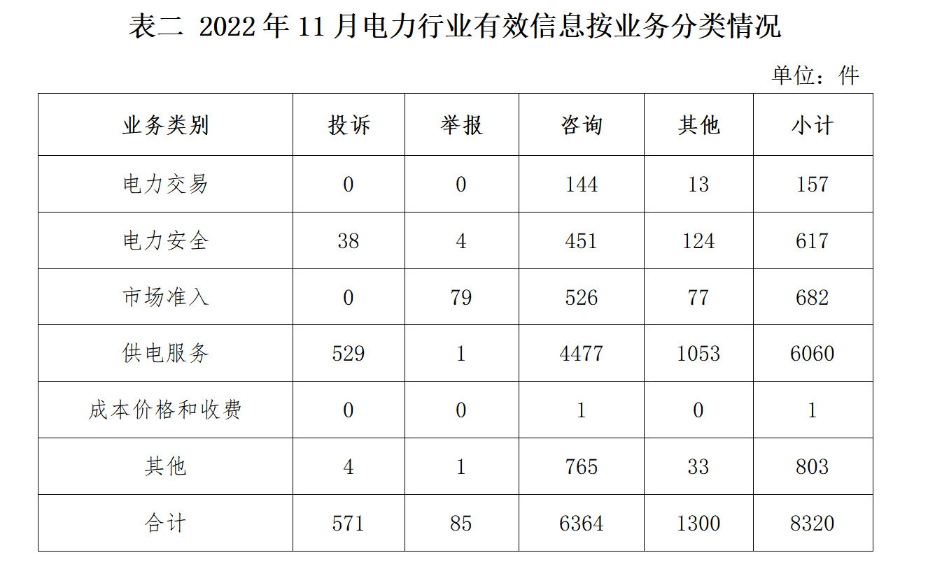電力行業(yè)排在首位,有效信息數(shù)量為8320件,占全部有效信息的60.22%。群眾關(guān)注的內(nèi)容主要集中在供電服務(wù)、電力安全、市場準(zhǔn)入等方面。(2022年11月電力行業(yè)有效信息按業(yè)務(wù)分類情況見表二)