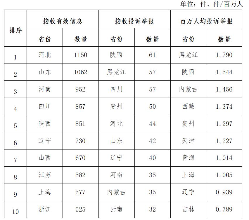各省(自治區(qū)、直轄市)按照接收的有效信息數(shù)量排序,河北、山東、河南、四川、陜西、遼寧、山西、江蘇、上海、浙江排在全國(guó)前10位;按照接收的投訴舉報(bào)數(shù)量排序,陜西、黑龍江、四川、貴州、河北、山東、遼寧、河南、內(nèi)蒙古、云南排在全國(guó)前10位;按照百萬(wàn)人均投訴舉報(bào)數(shù)量排序,黑龍江、陜西、內(nèi)蒙古、西藏、貴州、天津、青海、上海、遼寧、吉林排在全國(guó)前10位。(2023年1月有效信息及投訴舉報(bào)排名前10位情況見(jiàn)表三)