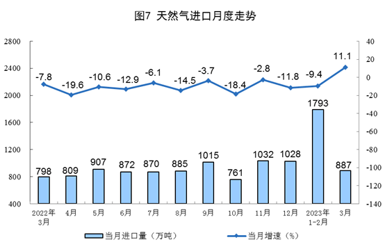 1—3月份,生產(chǎn)天然氣595億立方米,同比增長(zhǎng)4.5%。進(jìn)口天然氣2675萬(wàn)噸,同比下降3.6%。