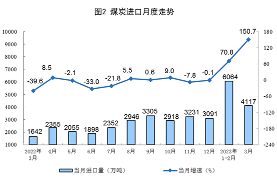 原煤生產(chǎn)穩(wěn)定增長(zhǎng),進(jìn)口大幅增加。3月份,生產(chǎn)原煤4.2億噸,同比增長(zhǎng)4.3%,增速比1—2月份放緩1.5個(gè)百分點(diǎn),日均產(chǎn)量1346萬(wàn)噸。進(jìn)口煤炭4117萬(wàn)噸,同比增長(zhǎng)150.7%,增速比1—2月份加快79.9個(gè)百分點(diǎn)。