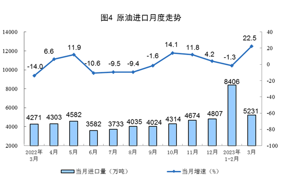 原油生產(chǎn)略有加快,進(jìn)口由降轉(zhuǎn)增。3月份,生產(chǎn)原油1818萬(wàn)噸,同比增長(zhǎng)2.4%,增速比1—2月份加快0.6個(gè)百分點(diǎn),日均產(chǎn)量58.7萬(wàn)噸。進(jìn)口原油5231萬(wàn)噸,同比增長(zhǎng)22.5%,1—2月份為下降1.3%。