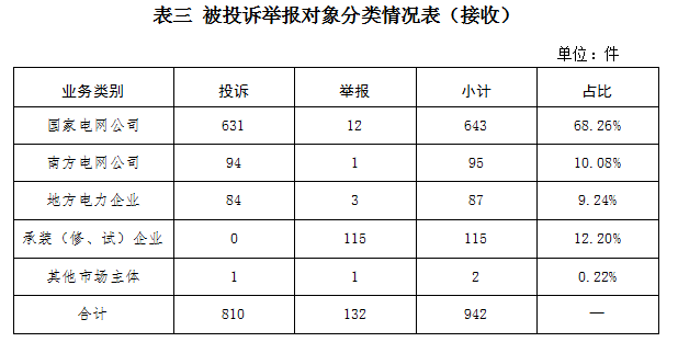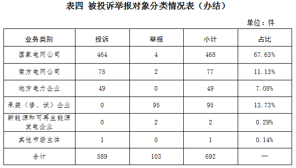從被投訴舉報(bào)對(duì)象看,供電企業(yè)594件、占投訴舉報(bào)總數(shù)的85.84%,其中國(guó)家電網(wǎng)公司468件、占比67.63%,南方電網(wǎng)公司77件、占比11.13%,地方電力企業(yè)49件、占比7.08%;承裝(修、試)電力設(shè)施施工企業(yè)95件、占比13.73%;新能源和可再生能源發(fā)電企業(yè)2件、占比0.29%;其他市場(chǎng)主體1件、占比0.14%。