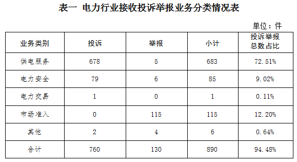 電力行業(yè)排在首位,數(shù)量為890件、占投訴舉報(bào)總數(shù)的94.48%,主要集中在供電服務(wù)、市場(chǎng)準(zhǔn)入、電力安全等方面。