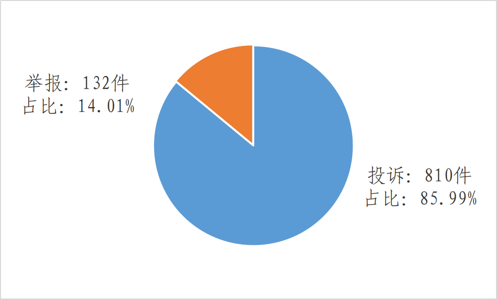 2023年6月,12398熱線(xiàn)共接收投訴舉報(bào)942件,環(huán)比增長(zhǎng)19.85%、同比下降34.76%。其中:投訴810件,環(huán)比增長(zhǎng)17.39%、同比下降41.39%;舉報(bào)132件,環(huán)比增長(zhǎng)37.50%、同比增長(zhǎng)112.90%。