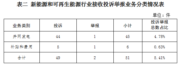 新能源和可再生能源行業(yè)排在第二位,數(shù)量為51件、占投訴舉報(bào)總數(shù)的5.41%,主要集中在并網(wǎng)發(fā)電、補(bǔ)貼和費(fèi)用等方面。