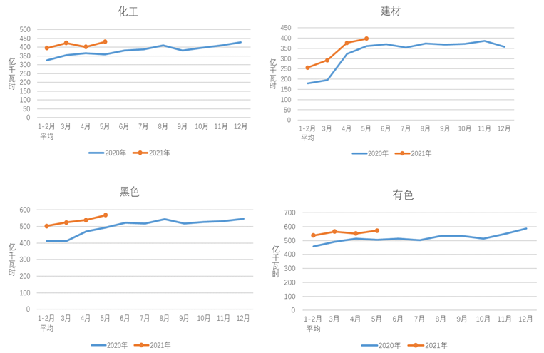 1-5月,化工行業(yè)用電量2048億千瓦時(shí),同比增長(zhǎng)12.8%,增速比上年同期提高17.0個(gè)百分點(diǎn);建材行業(yè)用電量1580億千瓦時(shí),同比增長(zhǎng)24.4%,增速比上年同期提高31.8個(gè)百分點(diǎn);黑色金屬冶煉行業(yè)用電量2639億千瓦時(shí),同比增長(zhǎng)18.3%,增速比上年同期提高19.8個(gè)百分點(diǎn);有色金屬冶煉行業(yè)用電量2763億千瓦時(shí),同比增長(zhǎng)10.2%,增速比上年同期提高8.2個(gè)百分點(diǎn)。