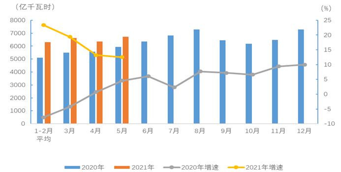 圖1 2020、2021年分月全社會(huì)用電量及其增速