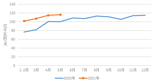 分產(chǎn)業(yè)看①,1-5月,第一產(chǎn)業(yè)用電量362億千瓦時(shí),同比增長(zhǎng)21.6%;第二產(chǎn)業(yè)用電量21779億千瓦時(shí),同比增長(zhǎng)18.6%;第三產(chǎn)業(yè)用電量5483億千瓦時(shí),同比增長(zhǎng)27.8%;城鄉(xiāng)居民生活用電量4681億千瓦時(shí),同比增長(zhǎng)4.1%。