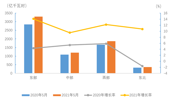 5月份,東、中、西部和東北地區(qū)全社會(huì)用電量增速分別為14.1%、9.5%、12.2%和10.7%。