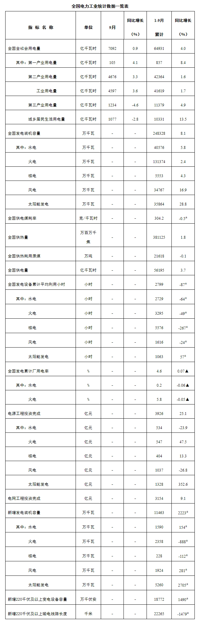 10月24日,國(guó)家能源局發(fā)布1-9月份全國(guó)電力工業(yè)統(tǒng)計(jì)數(shù)據(jù)。