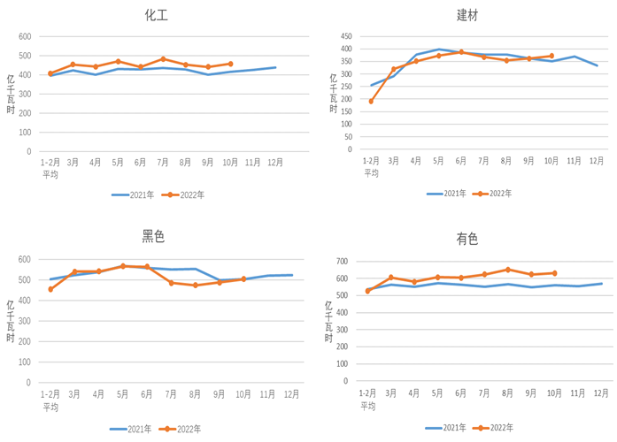 1-10月,化工行業(yè)用電量4523億千瓦時,同比增長5.3%;建材行業(yè)用電量3332億千瓦時,同比下降3.2%;黑色金屬冶煉行業(yè)用電量5087億千瓦時,同比下降4.9%;有色金屬冶煉行業(yè)用電量6182億千瓦時,同比增長2.9%。