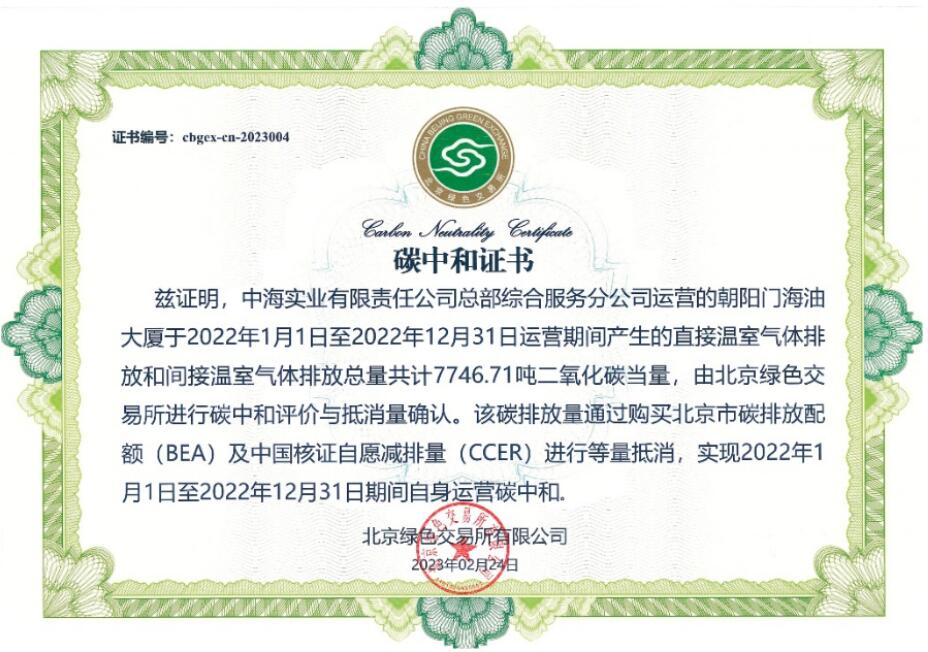 北京綠色交易所按照制定碳中和計(jì)劃、實(shí)施減排行動(dòng)、碳排放核算、北京碳配額及CCER等量抵消,“碳中和”評(píng)價(jià)和聲明等全流程要求,支持中國(guó)海油總部大樓實(shí)現(xiàn)年度自身運(yùn)營(yíng)“碳中和”目標(biāo),并頒發(fā)“碳中和”證書。