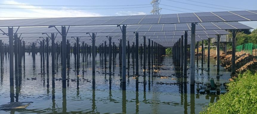 平坡光伏電站位于湛江市良垌鎮(zhèn),總裝機(jī)容量90兆瓦,項(xiàng)目采用漁光互補(bǔ)模式,在1650畝水養(yǎng)殖魚塘上架設(shè)光伏組件,利用水面上的光伏組件發(fā)電,水下則可進(jìn)行水產(chǎn)魚、鴨養(yǎng)殖。同時(shí),經(jīng)充分考慮白鷺等趨光性鳥類的生活特性,項(xiàng)目采用透光率極高的單晶雙玻雙面太陽能電池,其透光率達(dá)95%以上,因此,光伏陣列的反射光極少,很好地保障了鳥類生活環(huán)境不受破壞,實(shí)現(xiàn)了生態(tài)保護(hù)和能源綠色發(fā)展雙贏。