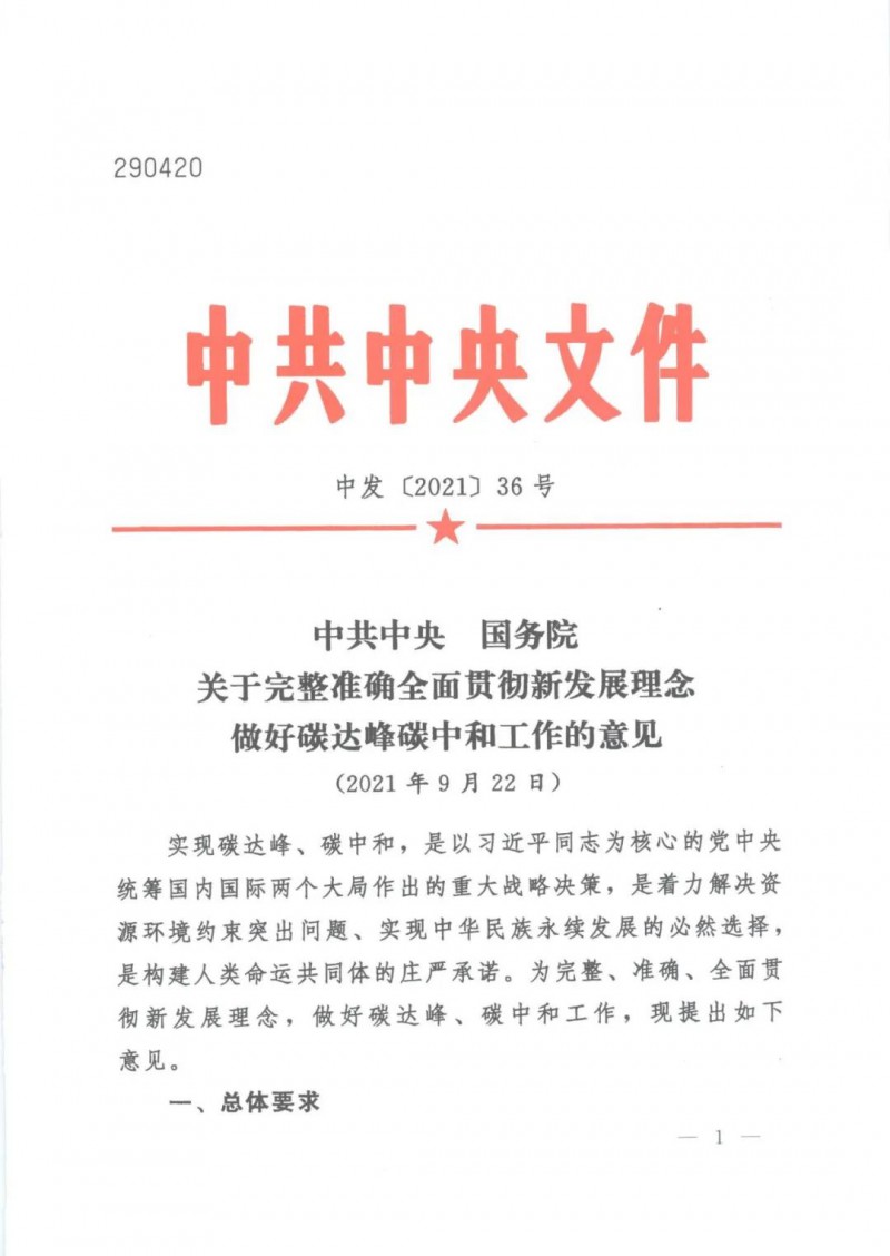 9月22日,中共中央下發(fā)《關于完整準確全面貫徹新發(fā)展理念做好碳達峰碳中和工作的意見》。