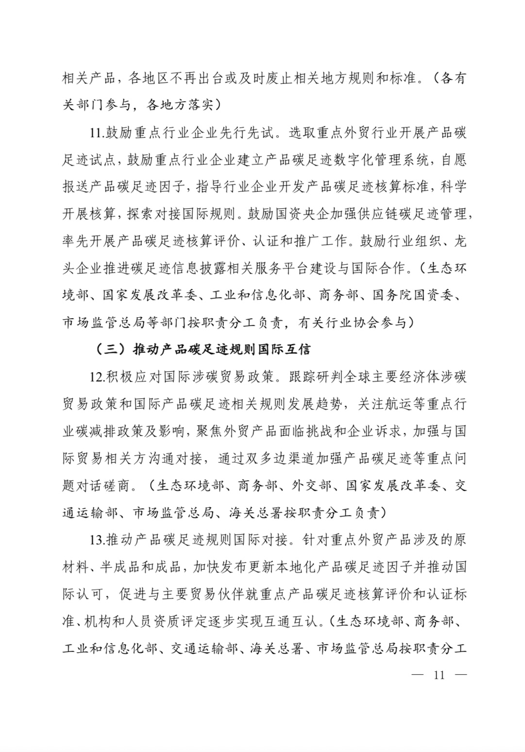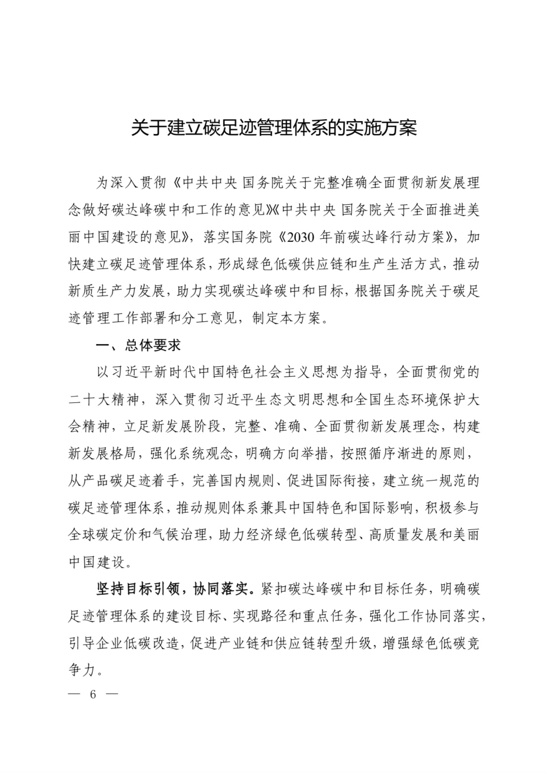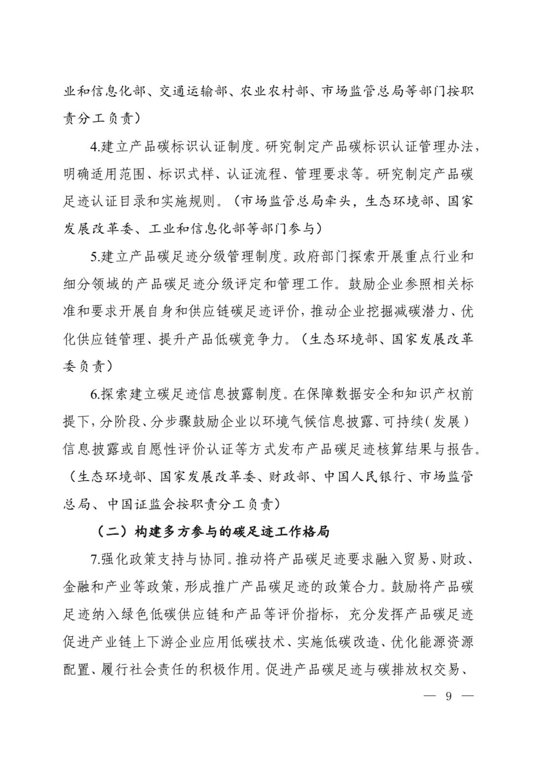 為深入貫徹落實《中共中央 國務(wù)院關(guān)于全面推進美麗中國建設(shè)的意見》《中共中央 國務(wù)院關(guān)于完整準確全面貫徹新發(fā)展理念做好碳達峰碳中和工作的意見》和《2030年前碳達峰行動方案》部署要求,加快建立碳足跡管理體系,形成綠色低碳供應(yīng)鏈和生產(chǎn)生活方式,推動新質(zhì)生產(chǎn)力發(fā)展,助力實現(xiàn)碳達峰碳中和目標,生態(tài)環(huán)境部會同國家發(fā)展改革委、工業(yè)和信息化部、財政部、人力資源社會保障部、住房城鄉(xiāng)建設(shè)部、交通運輸部、商務(wù)部、中國人民銀行、國務(wù)院國資委、海關(guān)總署、市場監(jiān)管總局、金融監(jiān)管總局、中國證監(jiān)會、國家數(shù)據(jù)局制定了《關(guān)于建立碳足跡管理體系的實施方案》?,F(xiàn)印發(fā)給你們,請認真抓好落實。