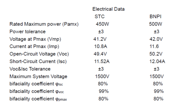 雙面銘牌輻照度(BNPI)定義為:組件正面接收1000w/m²輻照度同時(shí)背面接收135w/m²輻照度下的電性能,除了輻照度其他測(cè)試條件和STC一致,等效輻照度GE=1000w/m²+φ*135w/m²。
