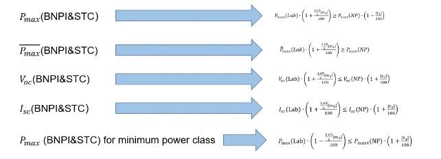 判定公式如圖2所示,其中m1 和 t1 分別為Pmax 的實(shí)驗(yàn)室測(cè)試不確定度和生產(chǎn)商給出的功率公差上限的百分比。r則代表實(shí)驗(yàn)室測(cè)試的可復(fù)性。
