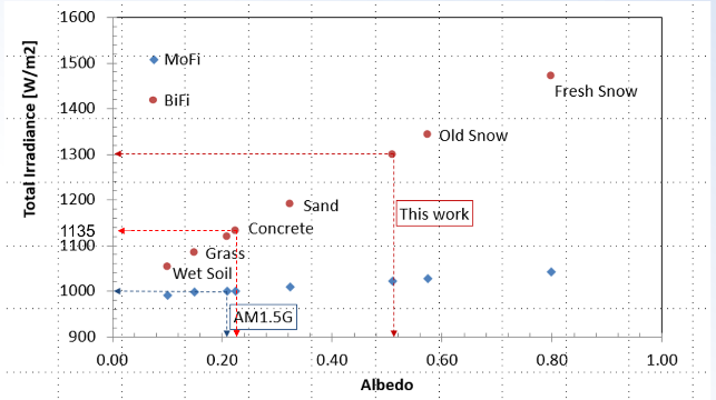 圖1中縱軸包括兩個(gè)關(guān)鍵點(diǎn):1300w/m²和1135w/m²。135w/m²對(duì)應(yīng)于IEC 60904-3中定義的環(huán)境條件下雙面組件離地高度1米時(shí)背面所接受到的平均輻照度?;诖说玫降碾p面組件在BNPI條件下的測(cè)試結(jié)果不僅與傳統(tǒng)STC條件下的結(jié)果具有良好的兼容性,并且使在相同的條件下對(duì)雙面和單面組件的光伏性能進(jìn)行直接對(duì)比成為可能。除此外,BNPI條件下的性能測(cè)試結(jié)果也可以為組件選型和系統(tǒng)設(shè)計(jì)提供具有價(jià)值的參考信息。由于背面發(fā)電,雙面組件在戶外通常比單面組件產(chǎn)生更高的電流。較高的電流可能導(dǎo)致光伏組件局部溫度過(guò)高,特別是在發(fā)生電流聚集的區(qū)域。因此新版2021版 61215標(biāo)準(zhǔn)中的相關(guān)測(cè)試條件相應(yīng)進(jìn)行了修訂來(lái)反映出雙面組件在戶外高電流的情況。1300w/m²是綜合各種不同應(yīng)用場(chǎng)景下可能達(dá)到的背面輻照度的極端情況、實(shí)際應(yīng)用中這些場(chǎng)景的出現(xiàn)概率而確定的一個(gè)較為合理的強(qiáng)度,從圖1中也可以看出1300w/m²這個(gè)點(diǎn)已經(jīng)能覆蓋絕大部分的地表反射率,可以被認(rèn)為是一個(gè)合理的針對(duì)雙面組件可靠性驗(yàn)證測(cè)試的背面輻照度。