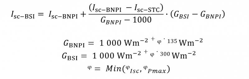 由于太能能模擬器可能達(dá)不到測(cè)試BSI的要求,因此可以用低輻照度下的電性能參數(shù)來(lái)推算高輻照度下的電性能參數(shù),公式如圖6所示: