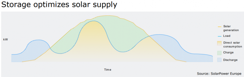 首先,我們從光伏發(fā)電特點和電網(wǎng)用電特點來看。圖一黃色的光伏發(fā)電曲線的計算模型中,僅有部分與用電曲線重合。裝配儲能系統(tǒng)后,當(dāng)光伏發(fā)電量大于用電量,儲能處于充電狀態(tài);當(dāng)用電量大于光伏發(fā)電量,儲能處于放電狀態(tài)。儲能系統(tǒng)充當(dāng)了一個很好的“能源調(diào)節(jié)器”,從而解決了“棄光”這個問題