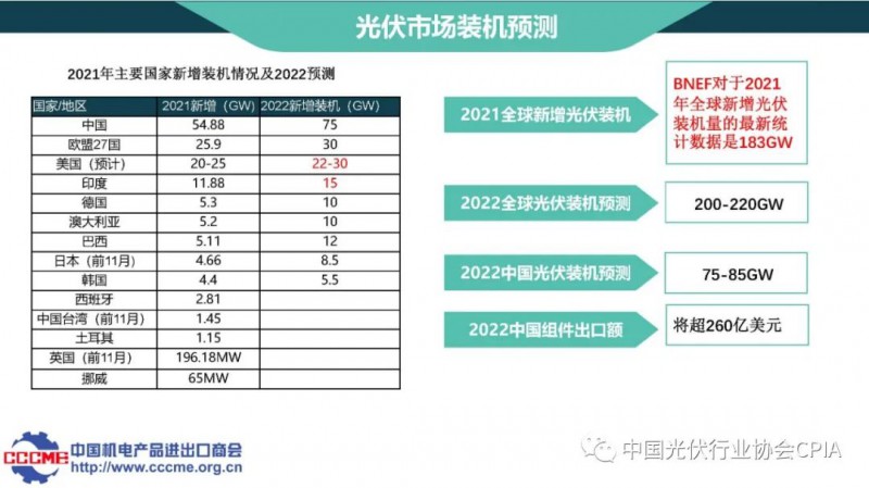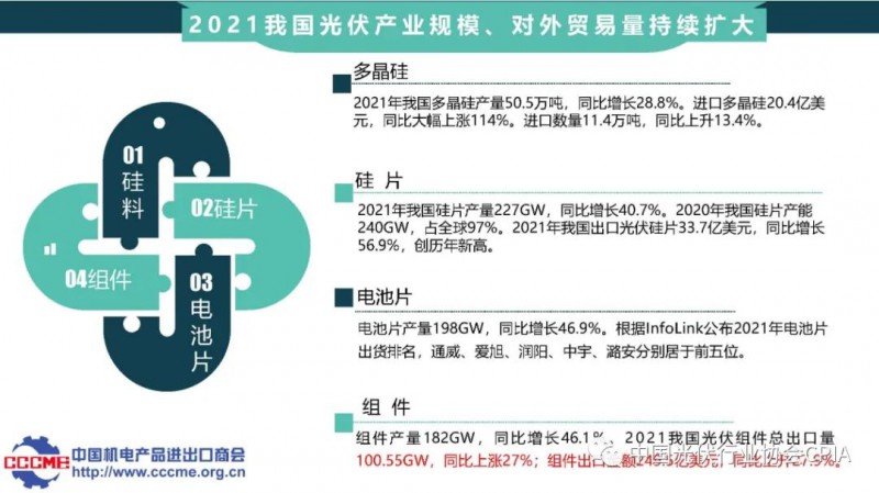中國機電產(chǎn)品進出口商會光伏分會秘書長張森介紹光伏產(chǎn)品國際貿(mào)易情況。2021年我國光伏產(chǎn)業(yè)規(guī)模、對外貿(mào)易量持續(xù)擴大,行業(yè)發(fā)展主要痛點是光伏貿(mào)易摩擦再次升級、海運費和匯率大幅上漲等。